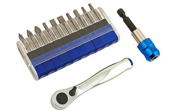 New handy ratchet and bit set from Laser Tools (part number 6027) contains the most commonly used bits, all stored in a dispenser unit that clips onto your belt.