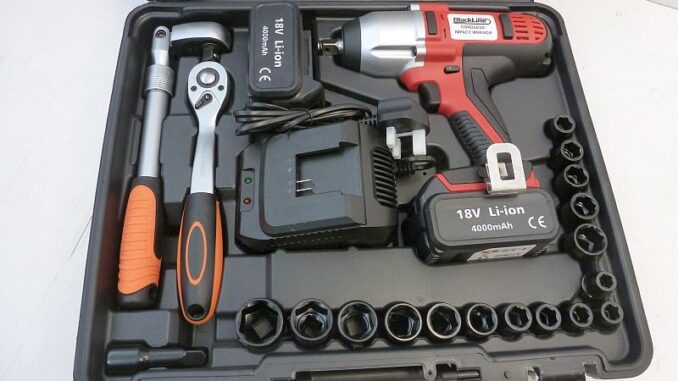 The set includes two 4Ah lithium batteries, 16 sockets (metric 10-27mm and Imperial ½in-13/16in) plus extension bar, all impact quality.