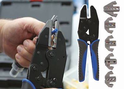 Laser Tools has just introduced this professional quality ratchet crimping tool set (part number 6484), which includes five pairs of die-sets suitable for a wide range of electrical terminals and connectors.
