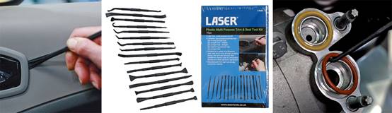 Now you need this in your toolbox: it’s a Plastic Multipurpose Trim and Seal Tool Kit from Laser Tools (part number 7709). It’s a light-duty, multipurpose, sixteen-piece toolkit. There are trim removing heads and pry bars. A selection of scrapers – which are great for removing sealant and cleaning and preparing machined faces on manifolds and cylinder heads and the composite construction will not damage the metal.