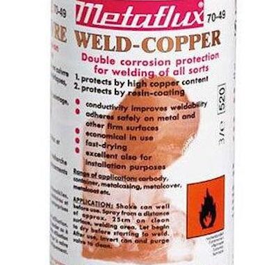 Here’s a great weld-thru primer. It’s called 70-49 Metaflux Copper Spray and it is a high-density metal-coating that gives superb conductivity.
