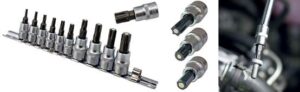 Part number 8898 is an 11-piece Star* bit set ranging in sizes from T10 to T60; the set is ideal for use on TORX* fasteners commonly found in automotive, mechanical, and industrial applications. A knurled ring on each socket ensures extra grip during use. Included are 1/4in drive socket bits: T10, T15, T20, T25, T27, T30 (length: 37mm), and 3/8in drive socket bits: T40, T45, T50, T55, T60 (length: 48mm).