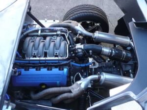 A list of firsts achieved by Tornado Sports Cars includes production of the replica cross-over exhaust system, production of adaption hubs to easily convert bolt-on to knock-off wheels, aluminium and carbon-fibre monocoque chassis and the use of the Ford Coyote V8 engine.