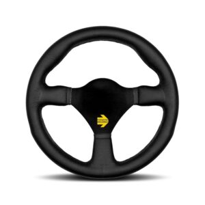 The un-drilled centre section and iconic yellow MOMO logo add to its racing aesthetic.